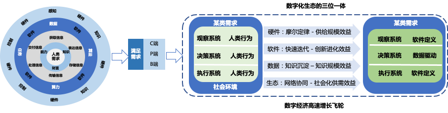 上面这张图右上部分描述了数字化驱动商业化的特性,为什么数字化会产生极高的商业价值和高速增长?它跟数字化产业生态的结构是分不开的。假如我们用数字化的能力去满足一类需求,一般都是这样三位一体的生态结构(如图右上部分所示)。