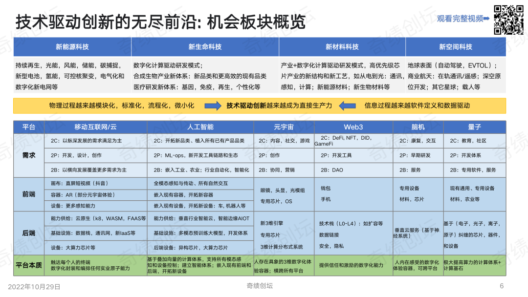 讲完了四个新科技驱动的创新前沿之后,我们再回去回顾一下这个总盘(第 6 页 ppt)。