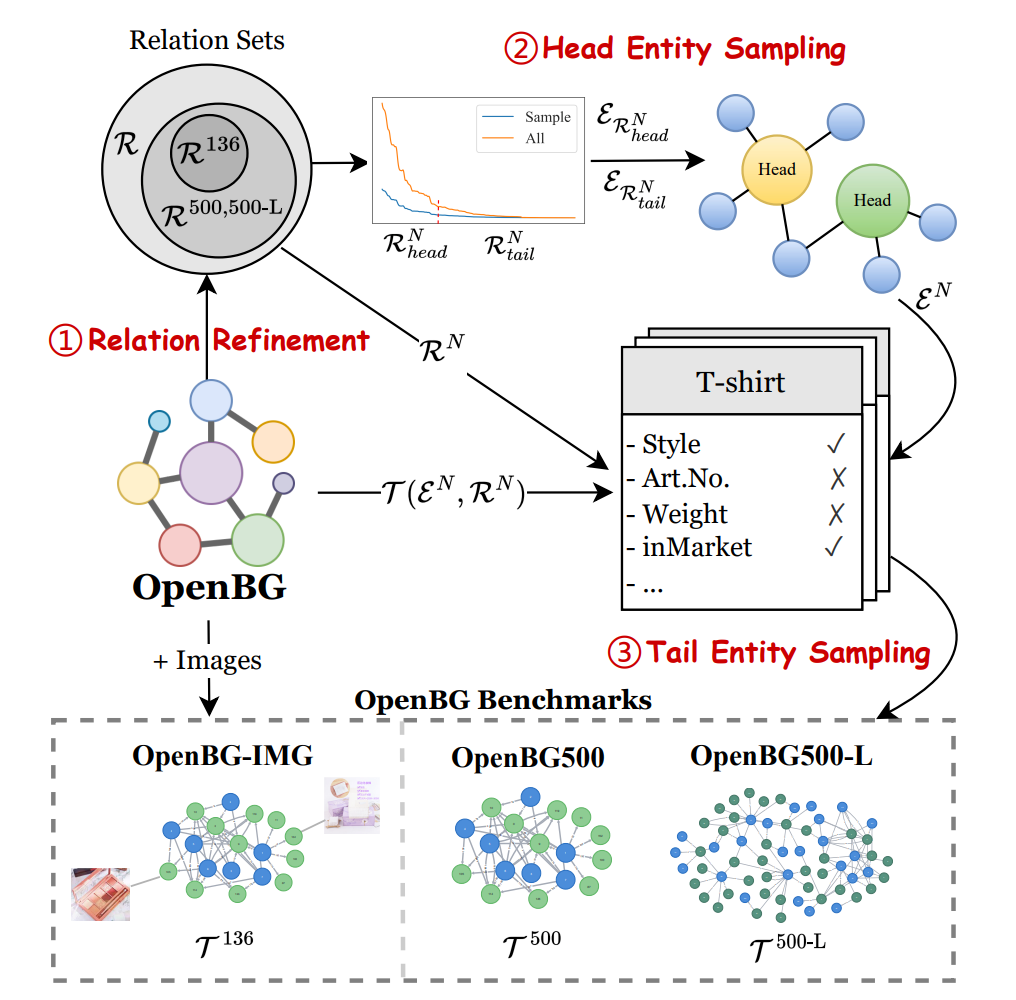与商品常识显著性推理以及同款挖掘任务不同的是,链接预测任务由 3 个子任务数据集组成:OpenBG500、OpenBG500-L 和 OpenBG-IMG。其中 OpenBG500 包含 500 类关系,含百万级别规模的图谱数据;OpenBG500-L 在 OpenBG500 的基础上扩大了数据规模,含千万级别规模的图谱数据,是电子商务领域大规模的知识图谱;OpenBG-IMG 是电商领域的多模态知识图谱。3 个数据集均以 OpenBG 为基础构建,构建流程如下: