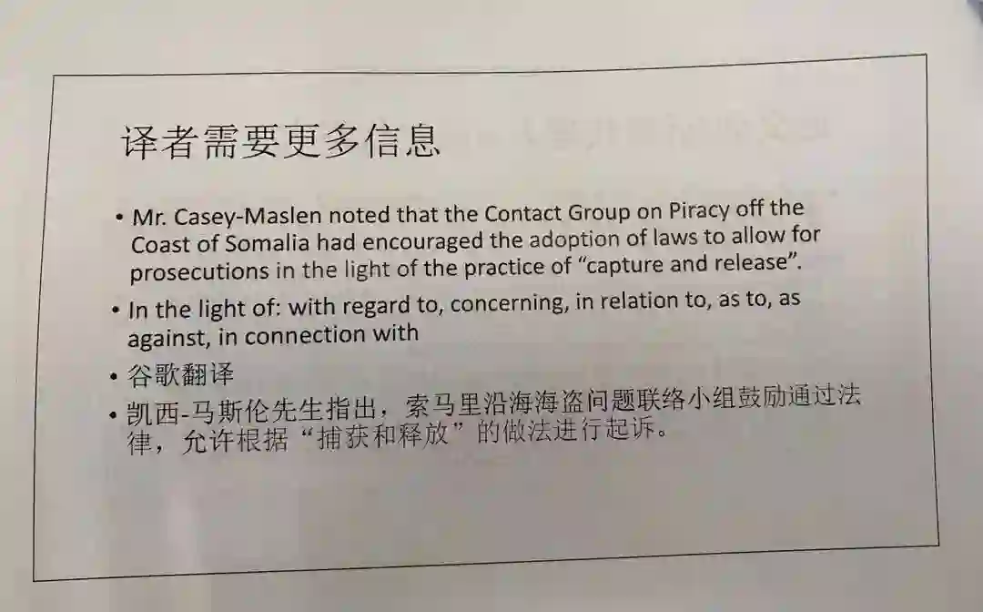 这种时候专业翻译就会去查阅相关资料,明白之后再进行翻译,“谁谁指出,鉴于一些国家存在先抓后放的做法,某小组鼓励相关国家通过立法允许起诉”。翻译是一个不断调查、不断获取文字背后意思的过程,表达的过程是在理解基础上自然形成的。