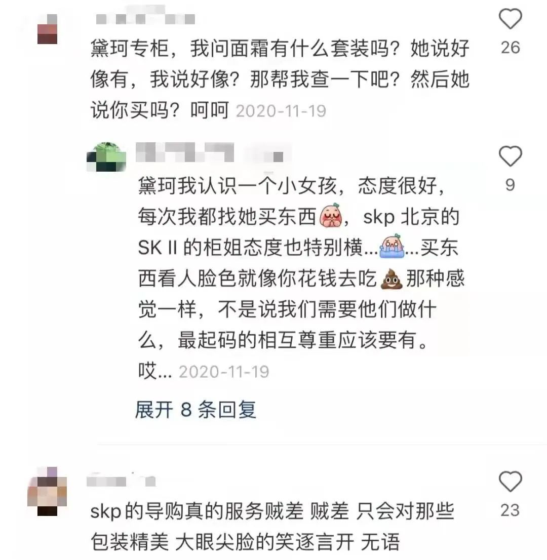 在评论区,不少人与博主有共鸣,“SKP的柜姐和小哥态度差到极点,白眼加冷漠,可能顾客欠他们钱”、“别人用手指路,她用下巴指路。”、“买几万块都感觉店员一副看不起人的样子”。