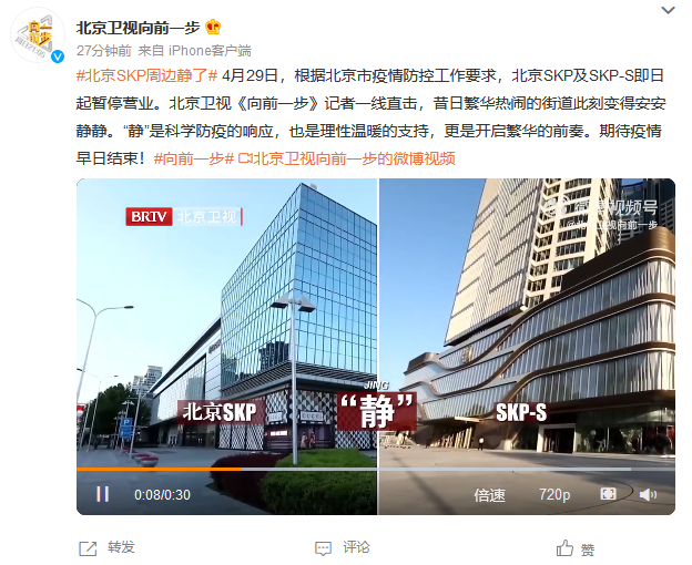 4月29日,北京SKP发布公告称,根据北京市疫情防控工作要求,北京SKP及SKP-S即日起暂停营业。