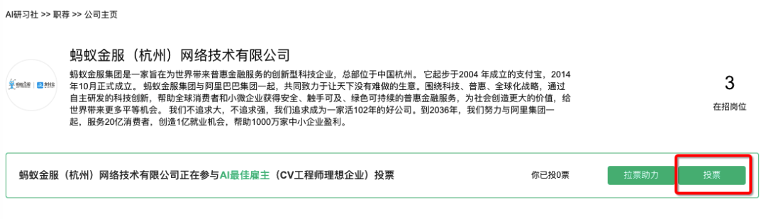进入最佳雇主活动页面,选择你支持的企业,点击「投票」按钮,进入相关企业公司主页。