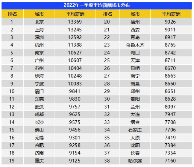 【一季度38个城市平均薪酬10014元】智联招聘发布了2022年第一季度《中国企业招聘薪酬报告》。数据显示,一季度全国38个核心城市平均薪酬为10014元/月。其中北京(13369元/月)、上海(13245元/月)、深圳(12592元/月)和杭州(11388元/月)四地的月薪处于领先地位。