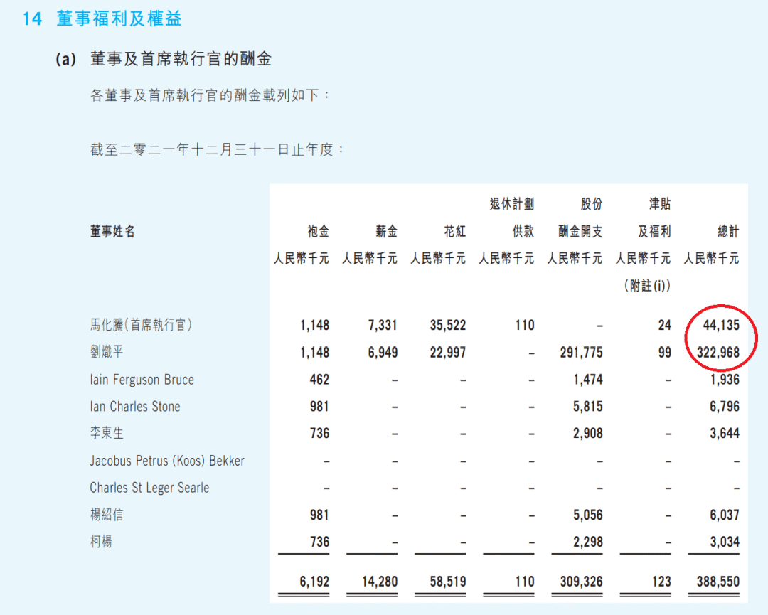 据腾讯年度报告,腾讯董事会执行董事兼总裁刘炽平2021年年度酬金3.23亿元,同比下降约24%。腾讯董事会主席兼首席执行官马化腾2021年年度酬金为4413万元,同比下降约25%。刘炽平的年薪在腾讯并非最高,年报显示,有两位高管的年度薪酬超过12亿元。(南方PLUS)