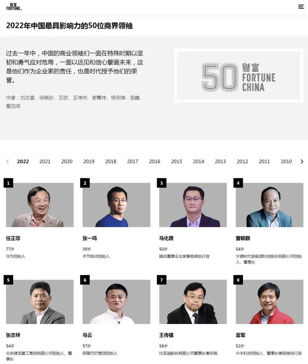 财富中文网发布2022中国最具影响力50位商界领袖榜单,华为创始人任正非、字节跳动创始人兼全球首席执行官张一鸣、腾讯董事会主席兼首席执行官马化腾分列前三。马云从2020年的榜首已逐步下滑至2022年的第六。(中新经纬)