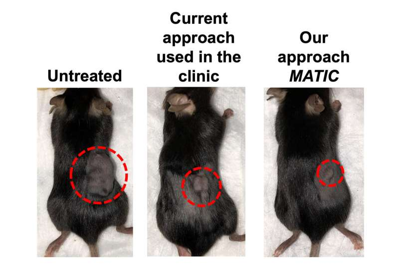 图 | 与用传统细胞治疗方法治疗的小鼠相比,用新的细胞治疗方法治疗的小鼠的肿瘤显着缩小。(来源:Shana Kelley Lab / Northwestern University)