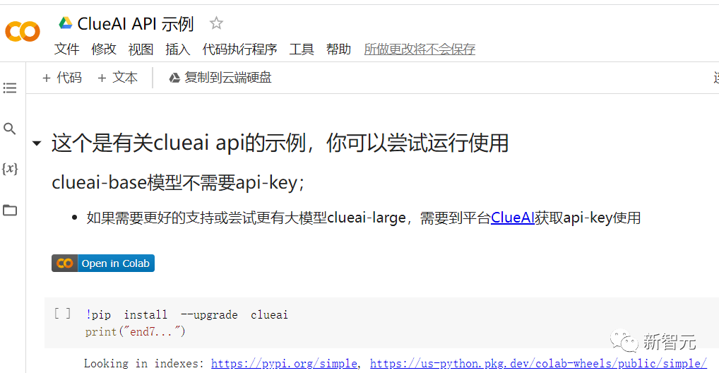 使用时也很方便,如果是基础模型直接运行即可,尝试大模型需要在ClueAI官方网站获取api-key才能使用。