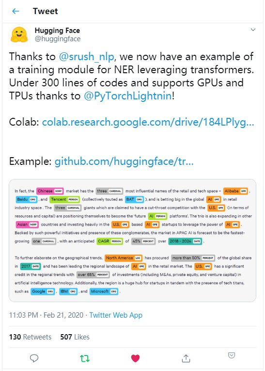 这几天,Hugging Face在Twitter感谢了Sasha Rush为他们的huggingface/transformers项目提供的示例代码,该代码仅用300行就实现了命名实体识别(NER)功能。