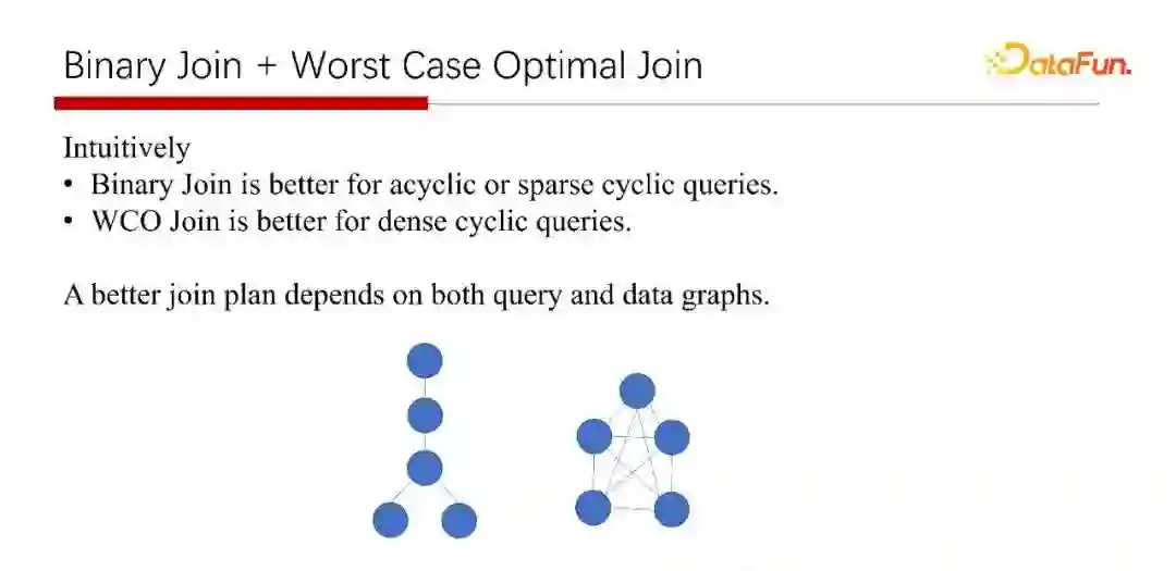 启发式地讲,Worst Case Optimal Join和Binary Join各有好处。Binary Join比较适合没有环或者是树形或者环比较稀少的查询图。Worst Case Optimal Join比较适合密集环形的查询图。因此,比较好的Join方法是依赖于查询图的图结构。