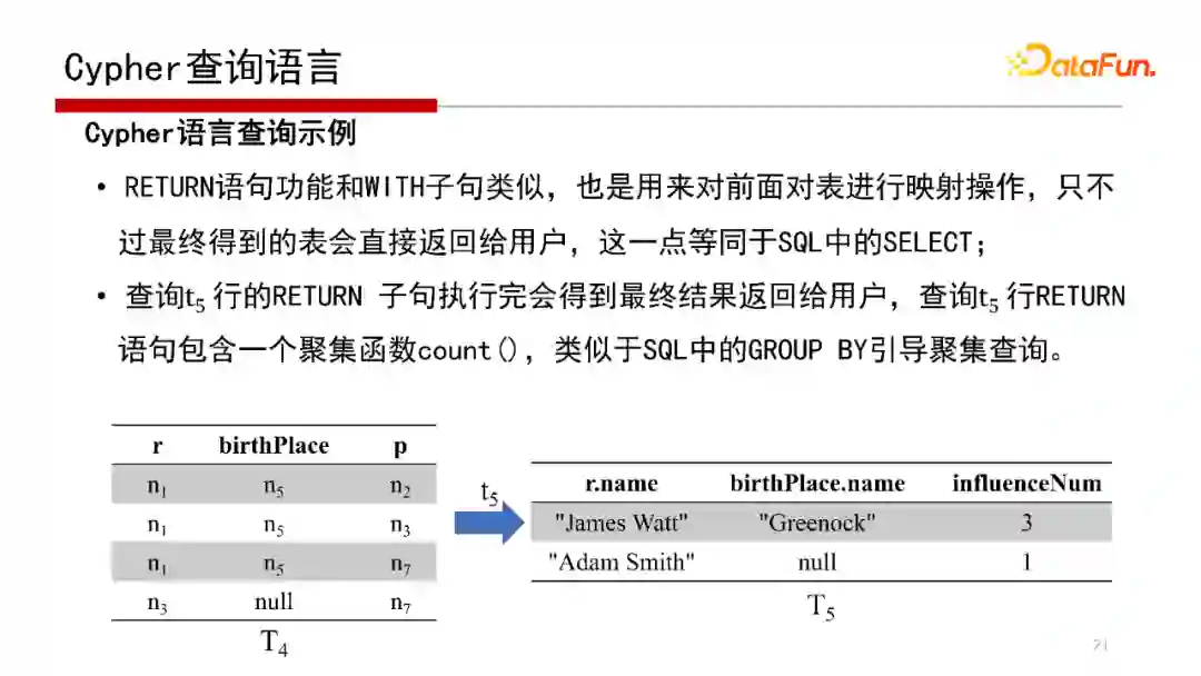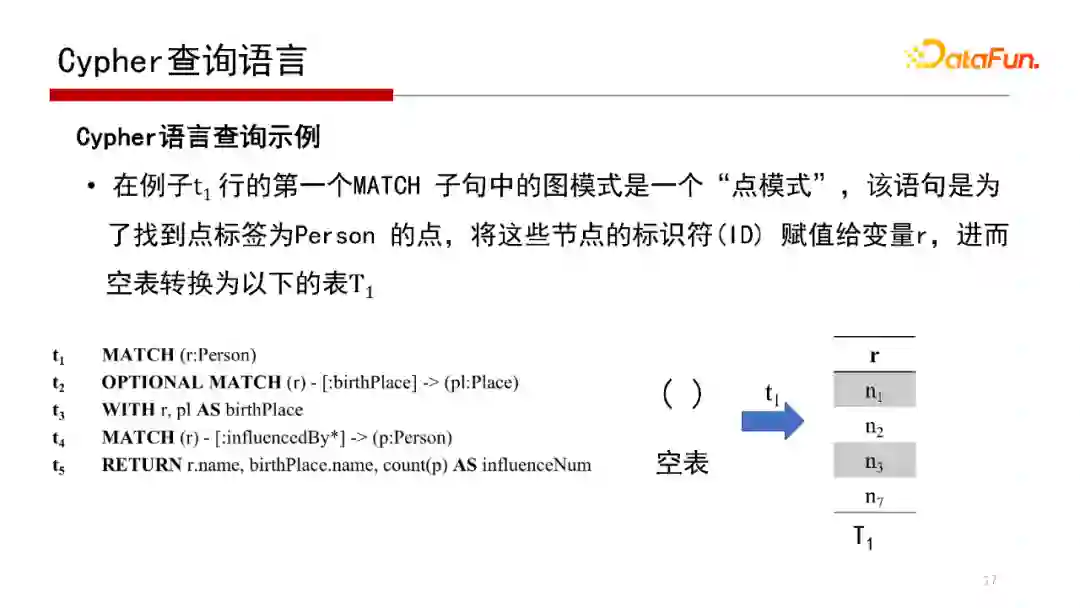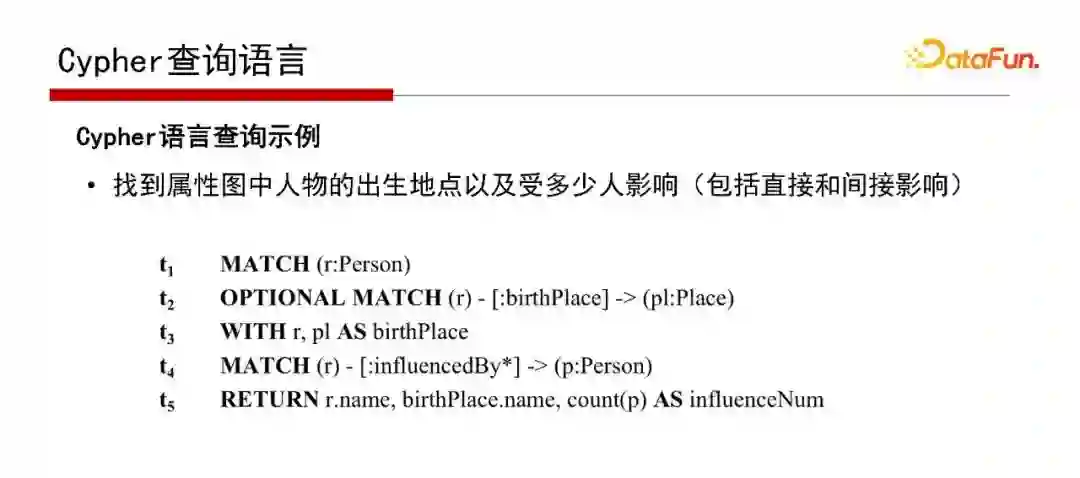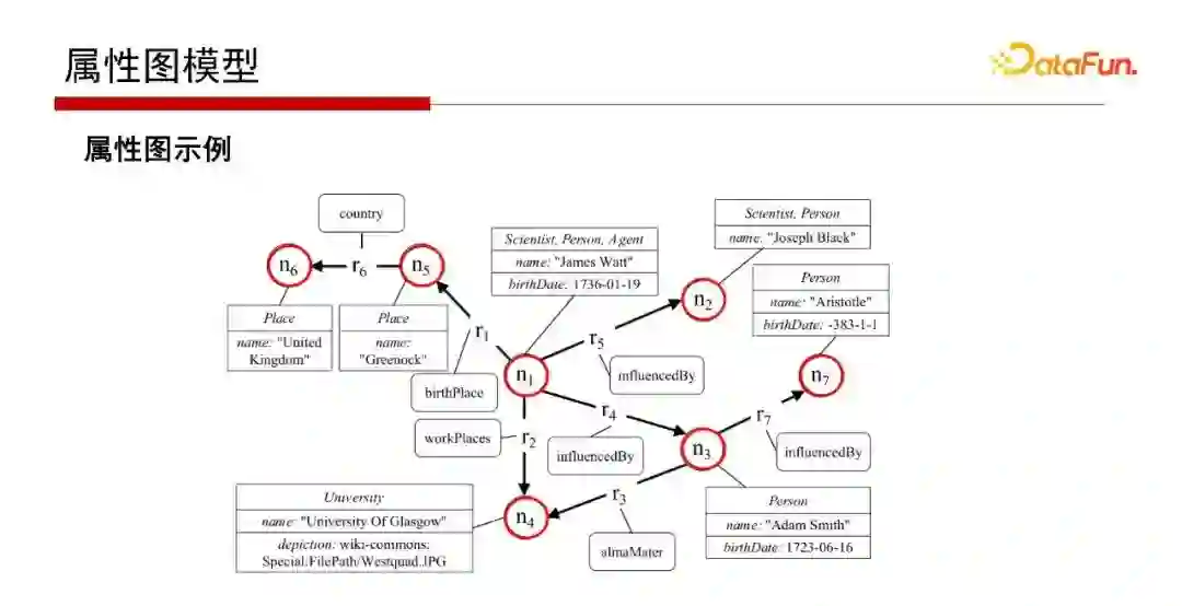 属性图如之前所讲,其点和边都是有属性表的,如Person,Person的名字name、Person的birthDate;如边r7上目前只画了标签influencedBy,但实际也可以是属性表的。这是属性图的一个非常好的优势。