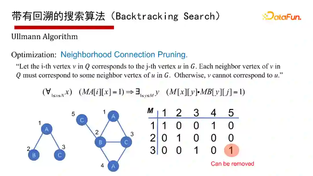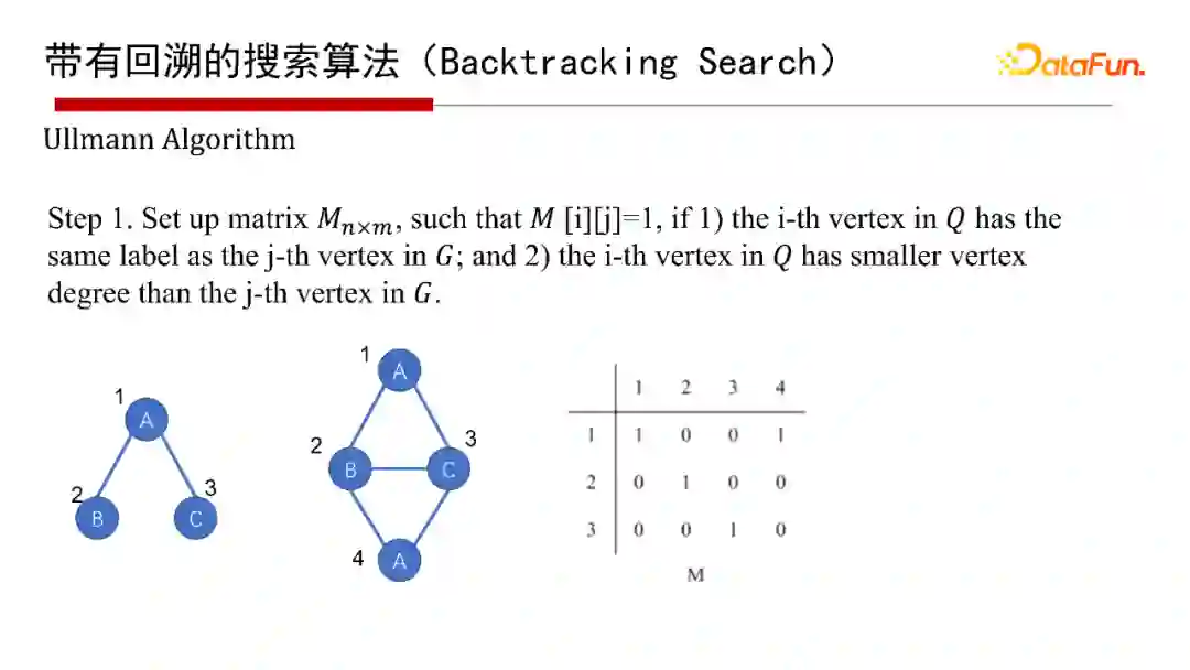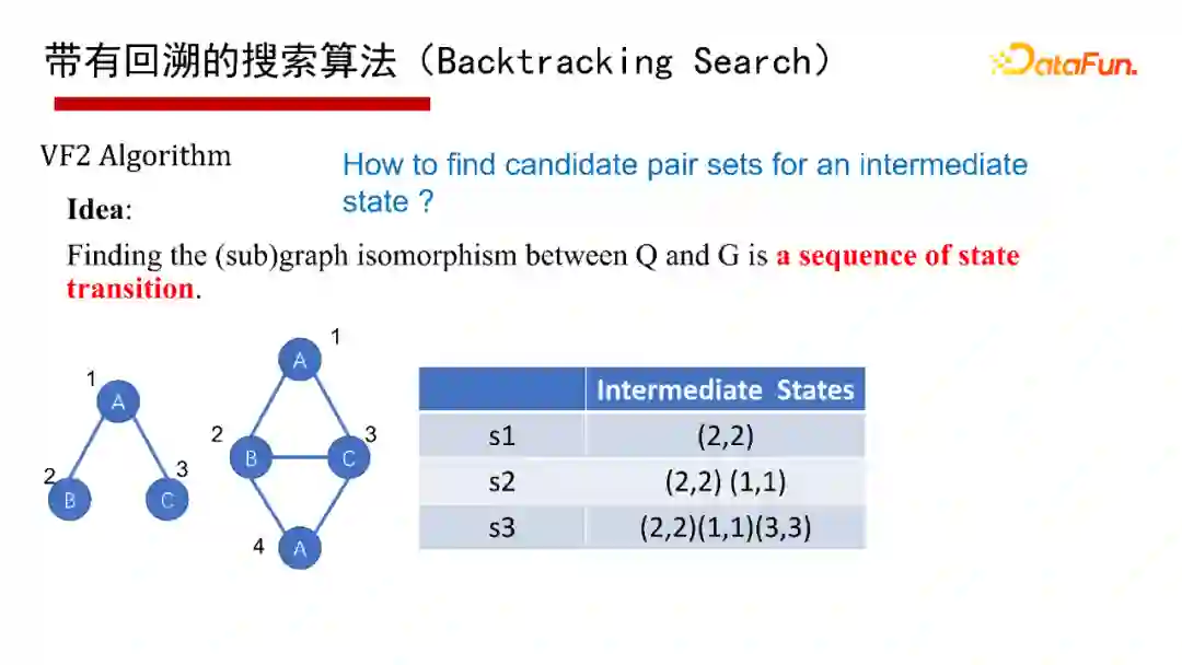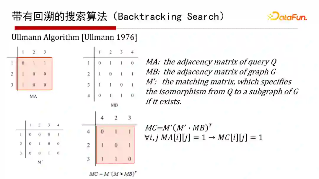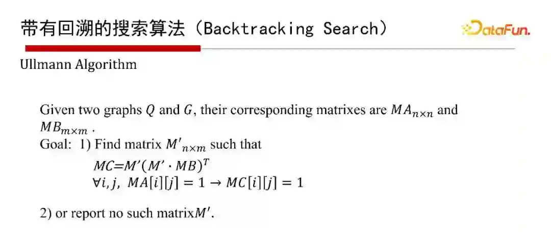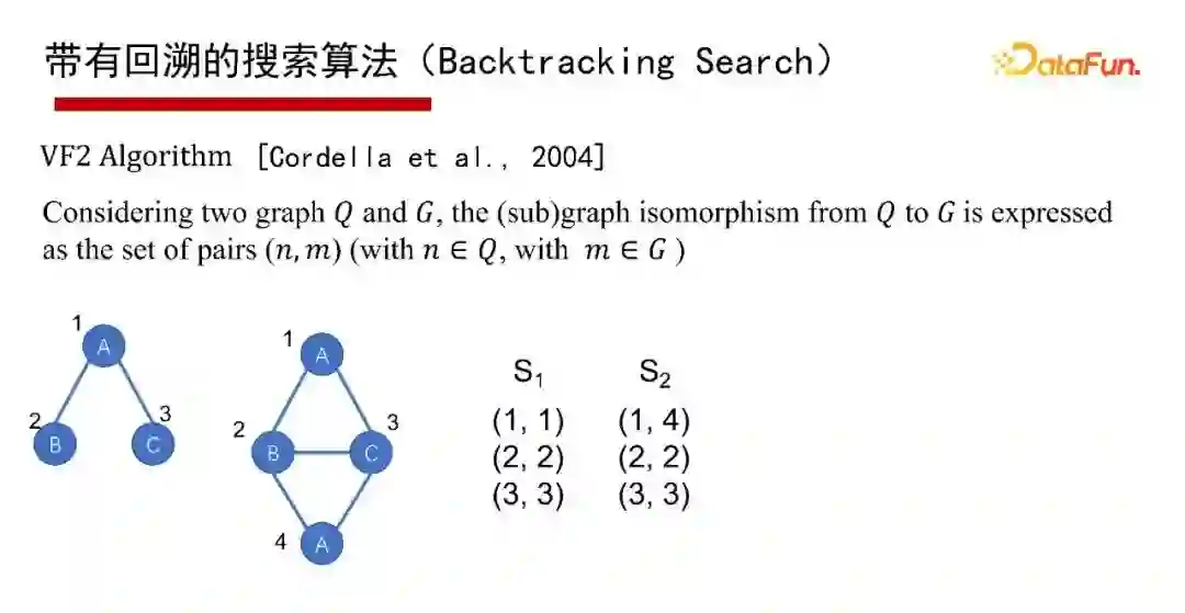 带有回溯的搜索算法(Backtracking Search),有1976年最早开始的Ullmann算法,2000年的Ullmann Algorithm算法,2004年的VF2 Algorithm算法等,这里就不再具体介绍算法本身了,有兴趣的同学们可以参考给出的参考文献。
