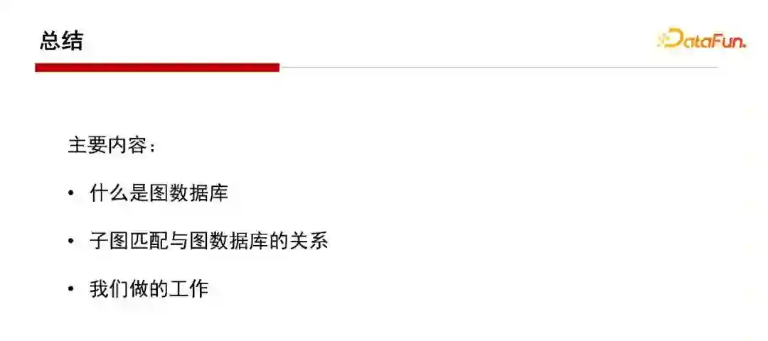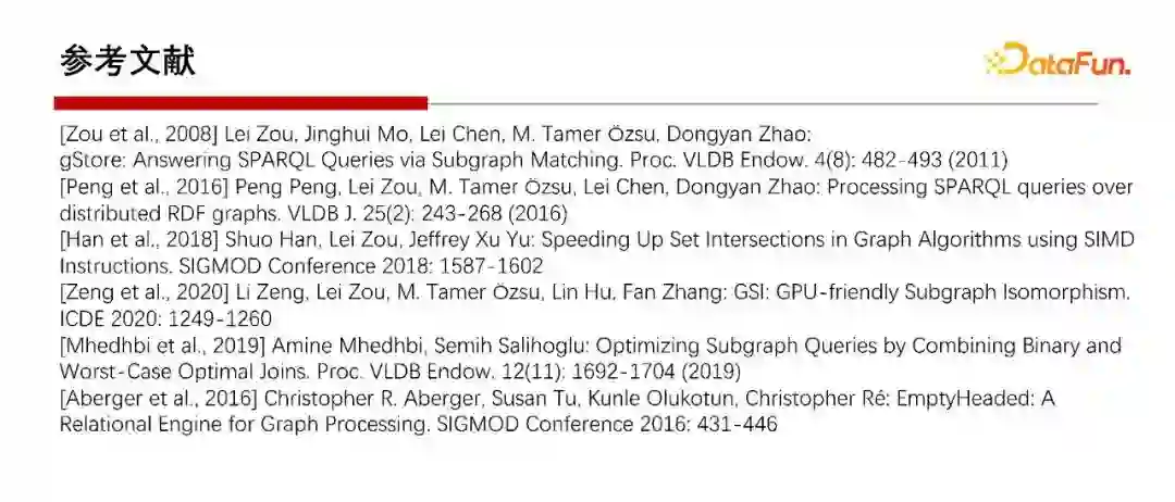 最后,总结一下:首先介绍了什么是图数据库以及我们对图数据库的一些思考;第二个重点关注查询引擎组件的工作,子图匹配和查询引擎之间的关系;第三个是对我们北京大学数据管理实验室(PKUMOD)的相关研究工作的介绍。