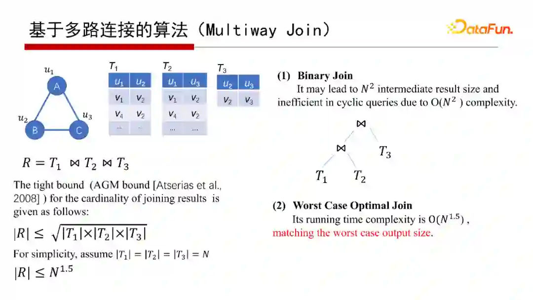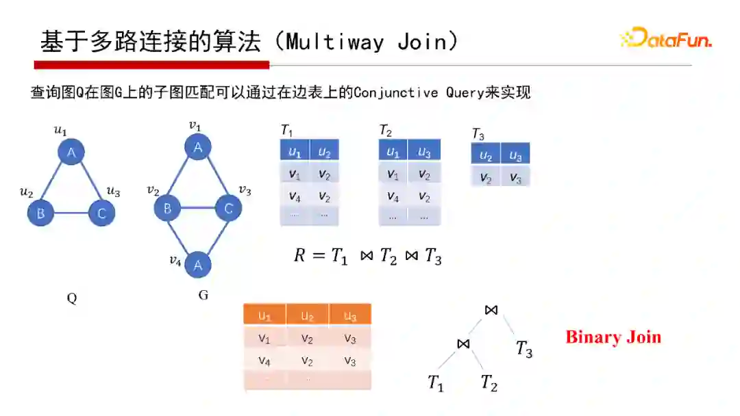 对于宽度优先的算法,实际关系数据库每次的Join就是宽度优先。子图匹配从逻辑来说是T1、T2、T3的Join操作。Join怎么执行呢?从Join执行角度来说,有两种不同的执行方案,一种是Binary Join,即第一张表T1和第二张表T2作Join,结果再与第三张表T3作一次Join,是以边为中心。