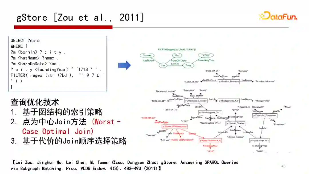 gStore系统思路从技术层面,在索引的方式、Join的策略和Join顺序的选择提出了三种查询优化方式。在原来的系统版本中,采用的是以点为中心的策略,类似Worst Case Optimal Join,没有用Worst Case Optimal Join和Binary Join合在一起的。但在即将发布的1.0版本,则考虑了Worst Case Optimal Join 加 Binary Join合在一起的策略。