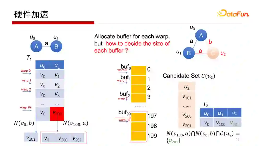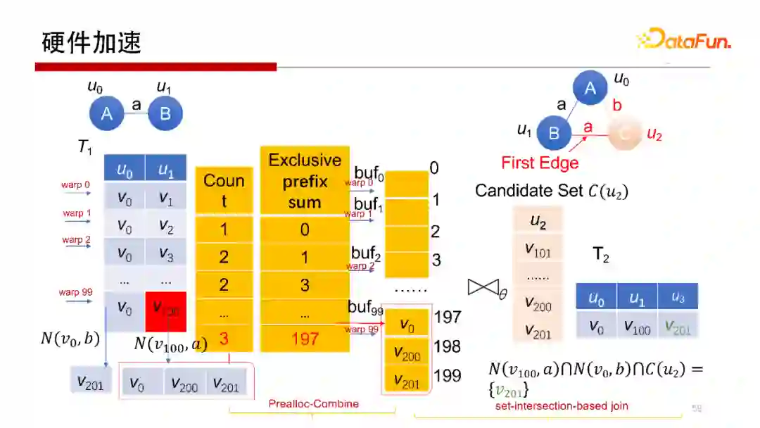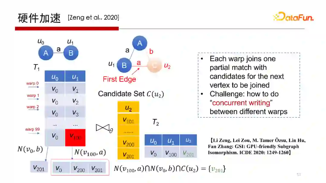 刚才提到,Worst Case Optimal Join算法,每一行是完全独立的查询操作,非常容易做并行。所以会想到使用在GPU上运行操作。但在GPU上执行操作,其每个线程或每个wrap做计算没有问题,但中间结果如何写回去,如何避免写冲突是需要考虑的。我们提出一种方案使得每一个wrap独立地去执行,并且可以独立地去写,在不需要加锁的方式下不会产生写冲突。