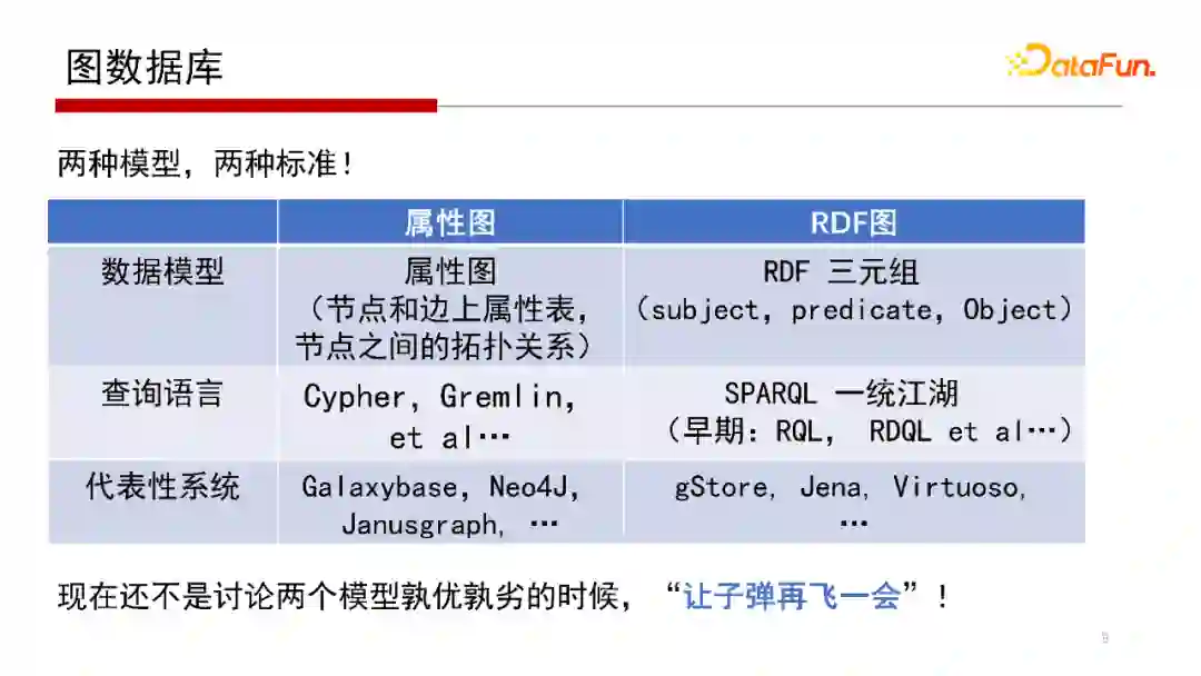 这两个模型孰优孰劣,现在还不是很好讨论,因为两个模型各有各的优劣。例如,语义网特点是比较容易支持后期的推理,而且其标准化做得比较好。而目前图数据库也正在做标准化的事情。评判两个模型的优劣也不应该仅从技术角度做评判,因此认为还不是评判的时候。下面我们简单介绍一下相关模型。