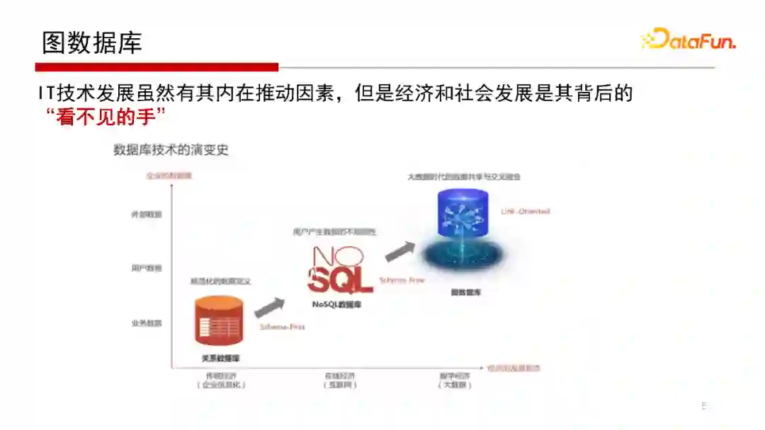 这里,我们重点观察一下从关系数据库到近些年NoSQL再到Graph Database。这一步一步转变,并不是说完全替代,只是随着经济和社会发展出现了NoSQL、出现了Graph Database。这里我们也不从软件系统演化的技术逻辑去做分析,而是从市场主体的企业的数据观角度去试图理解这点变化。前面已经提到关系数据库是Schema-First,其特点是需要有一个表结构,表结构来自E-R图,E-R图从需求来,需求来自企业本身对这个任务有一个很清晰的业务逻辑,它适合传统经济场景,解决的是传统企业的信息化问题。传统企业只有把问题信息化才有业务逻辑,才有需求,才能明确地画出E-R图。有了E-R图后才可以映射成表和表结构,通常情况下这个表结构不会做太大变化,因为关系数据库表结构或Schema做变化是一个非常耗时的任务。