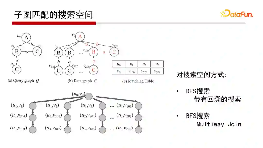 这里对子图匹配的两类算法形象化解释一下。假设有个Q和一个G,找到Q在G的子图匹配,实际就是在搜索空间查找。这里把搜索空间定义成一个搜索树(如上图左下角的属性图),Backtracking Search搜索的策略是深度优先(DFS搜索),再回溯回来;Multi-way Join搜索的策略则是宽度优先(BFS搜索),即在搜索树上一层一层去找。
