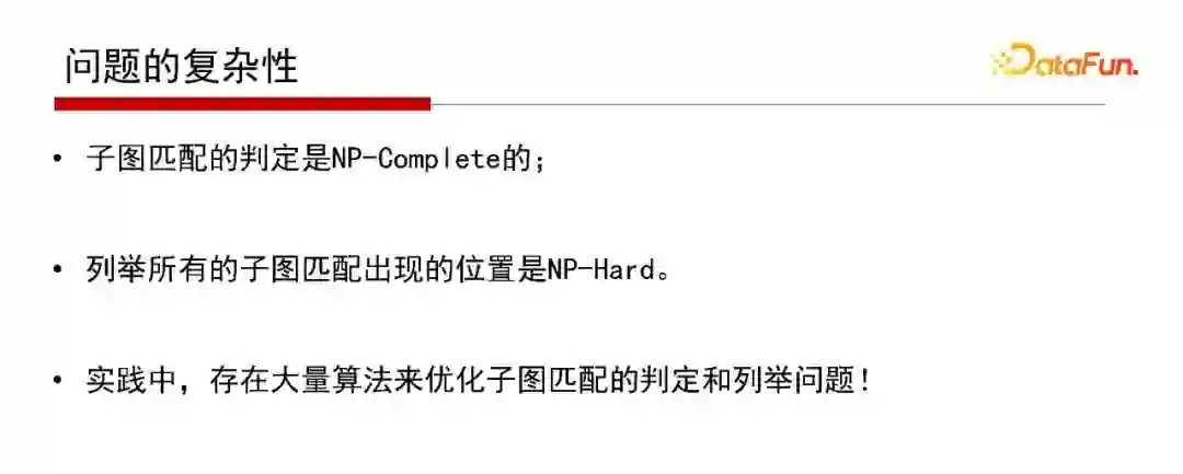 从计算复杂性来讲,子图匹配是一个非常复杂的问题。如果对查询图Q不加限制,子图匹配的判定是NP-Complete的;列举所有的子图匹配出现的位置是NP-Hard。虽然匹配算法本身是指数的,但在实践中,可以采用大量的过滤策略来检索搜索空间,从而提高查询的性能。