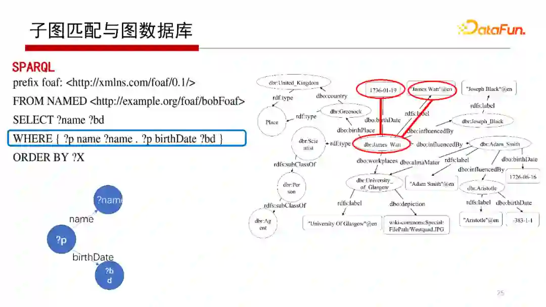 上面的SPARQL查询的WHERE子句部分,可以表达为一个查询图,如这页中的左下图。其中带有“?”的“?p”表示变量的含义。我们在这个例子中可以找到图G中的子图匹配,如红色表示的部分。执行上述SPARQL语句,本质上就是Q到G的子图匹配问题。其中,Q可能会更复杂,它不仅仅是Basic Graph Pattern(基础图模式),这个后面有机会再阐述。