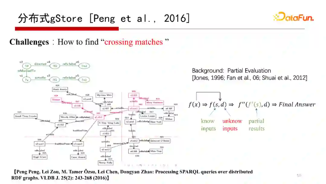 下面提到的是分布式gStore系统,解决的是单机存储不下一个大的RDF图,需要分布式存储在多个机器上,而查询结果跨在多台机器上的问题。我们在VLDB Journal 2016的一篇文章“Processing SPARQL queries over distributed RDF graphs”有介绍分布式gStore。