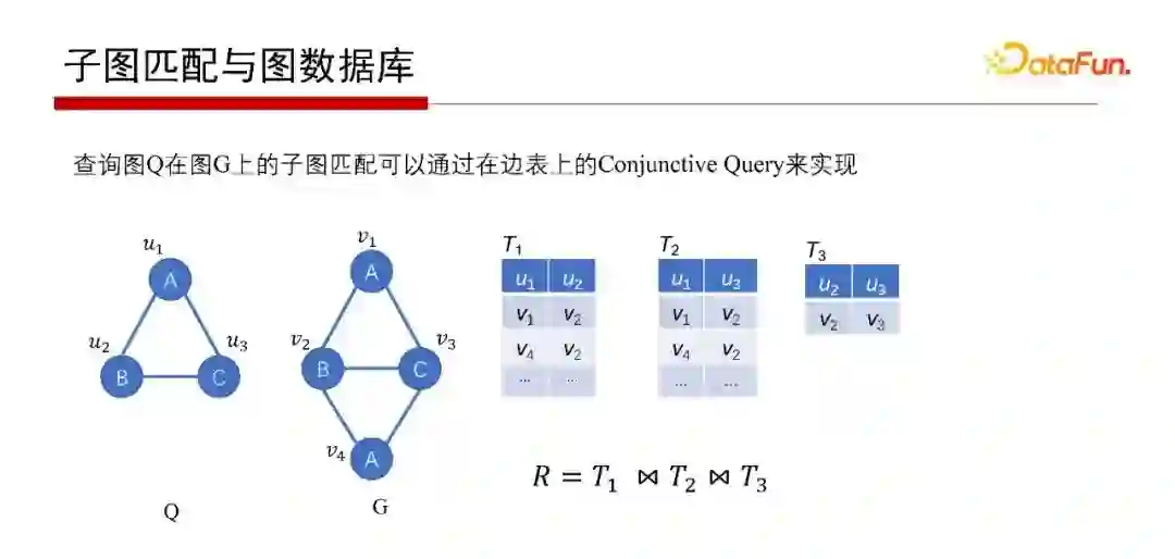 那子图匹配如何解呢?子图匹配问题用关系数据库也可以解。如上图G存在边表里,表示边的起点和终点。回答Q在G中的子图匹配查询,则分别先找到匹配查询图Q中的AB边的是T1表、匹配AC边的是T2表和匹配BC边的是T3表,然后T1、T2、T3做自然连接(Join)操作,如果结构非空,就找到Q的子图匹配了。所以,如果用关系代数来解决子图匹配的问题,则等同于关系数据库的Conjunctive Query。