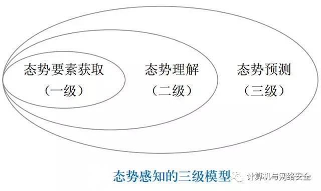 态势感知的概念最早在军事领域被提出,覆盖感知、理解和预测三个层次。并随着网络的兴起而升级为“网络态势感知(Cyberspace Situation Awareness,CSA)”。旨在大规模网络环境中对能够引起网络态势发生变化的安全要素进行获取、理解、显示以及最近发展趋势的顺延性预测,进而进行决策与行动。