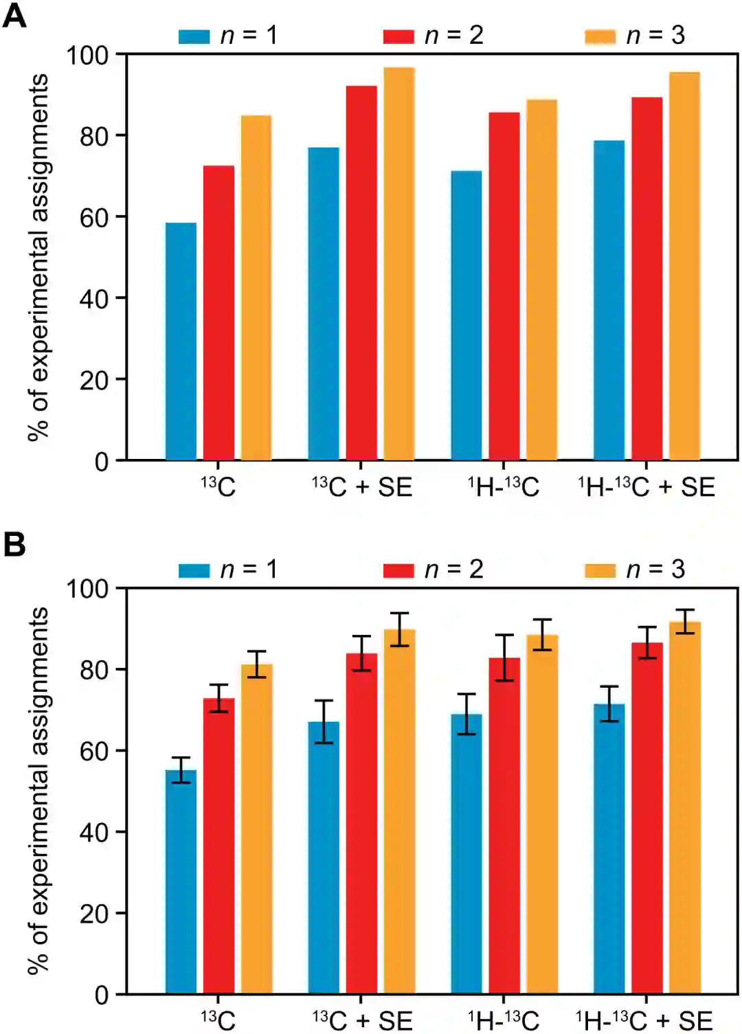 研究发现使用光谱编辑和相关的 1H-13C 化学位移分布,可以提高模型正确分配碳化学位移的能力。在超过 80% 的情况下,使用化学位移的二维统计分布、光谱编辑或两者的结合导致实验分配成为两个最可能的边缘分配之一。总体而言,实验基准集的性能与合成基准集一致,除了使用光谱编辑时,观察到实验集与合成集相比略有改进。