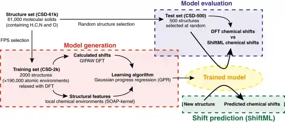 将剑桥结构数据库(CSD)与化学位移的机器学习模型(ShiftML)相结合,创建了自己的有机固体化学位移数据库,可以直接从分子固体结构预测化学位移。