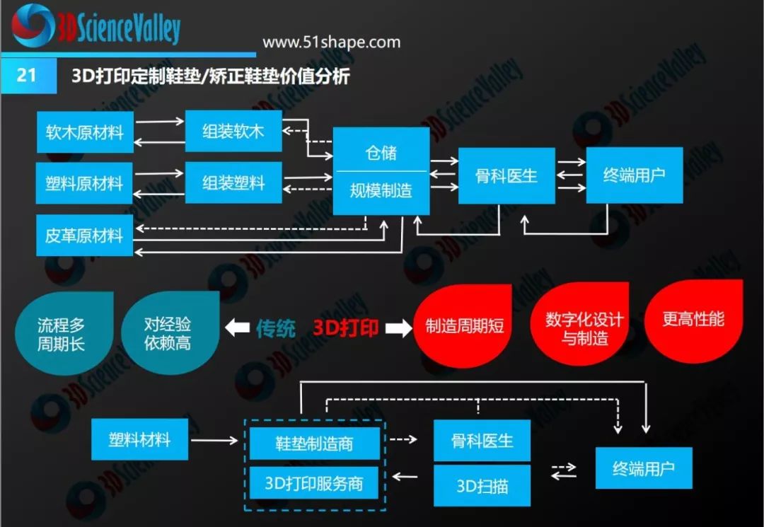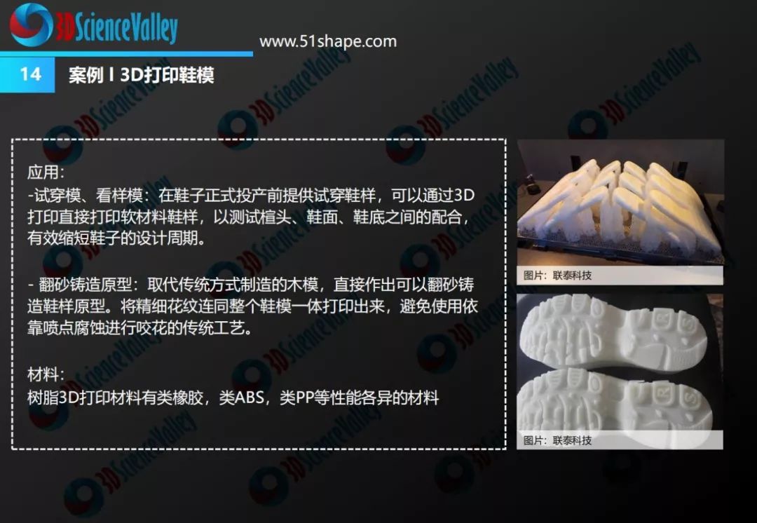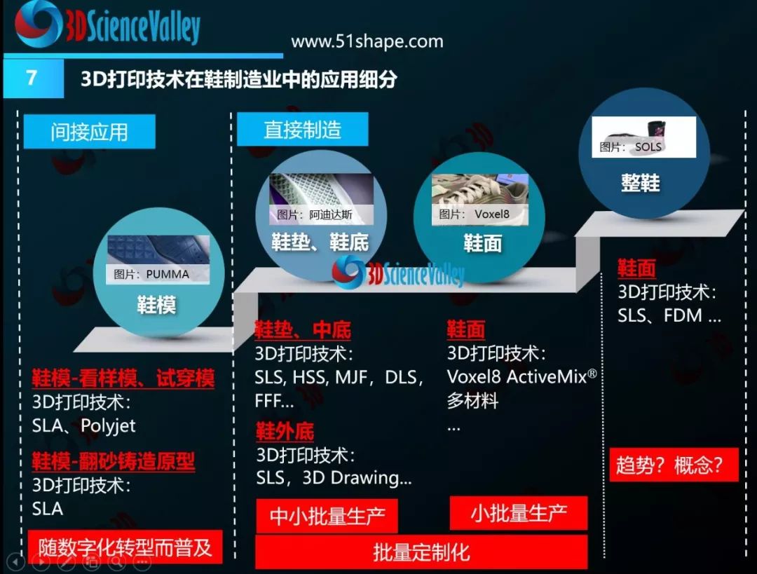 3D打印技术在鞋制造领域的应用主要包括:鞋模快速制造;鞋中底、鞋垫的中小批量生产,以及鞋面配件的小批量生产。这些应用将随着鞋制造企业向数字化技术的转型升级而逐渐加强。