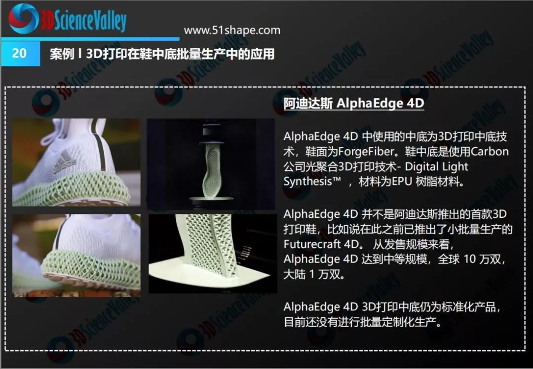 2017年以来,陆续登陆市场的几款带有3D打印鞋中底的运动鞋,例如阿迪达斯Futurecraft 4D,Under Amour Under Armour Architech,匹克Future I,都是运动鞋制造商在小批量定制化生产方面所进行的尝试。