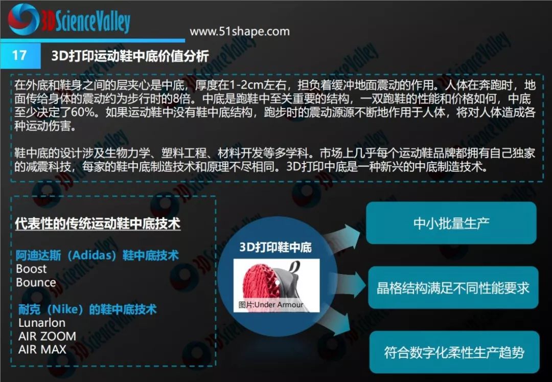 3D科学谷结合鞋制造技术和商业模式的发展趋势,在《3D打印与鞋制造技术白皮书1.0》中,对3D打印技术在鞋制造领域中的应用情况、应用价值、发展趋势等问题进行了剖析。
