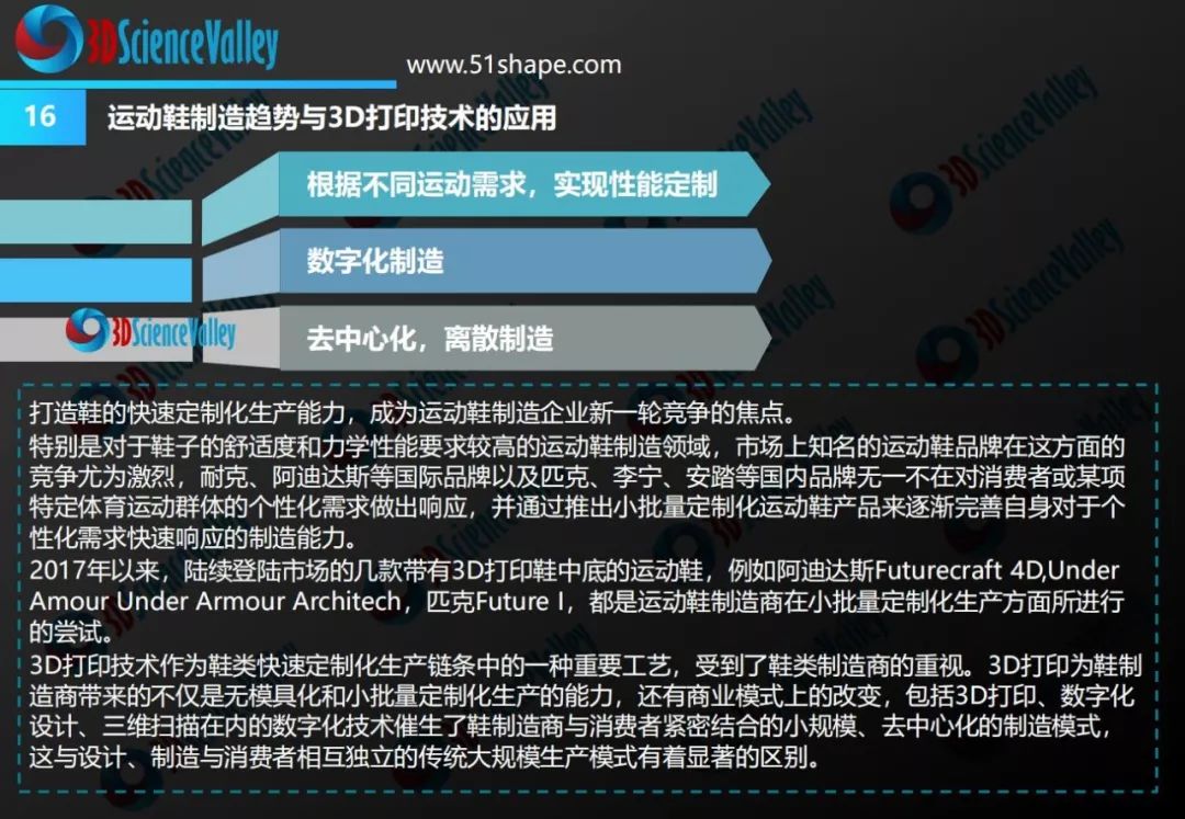特别是对于鞋子的舒适度和力学性能要求较高的运动鞋制造领域,市场上知名的运动鞋品牌在这方面的竞争尤为激烈,耐克、阿迪达斯等国际品牌以及匹克、李宁、安踏等国内品牌无一不在对消费者或某项特定体育运动群体的个性化需求做出响应,并通过推出小批量定制化运动鞋产品来逐渐完善自身对于个性化需求快速响应的制造能力。延伸阅读:不可逆的进行时,运动鞋的数字化及制造基地离散化趋势