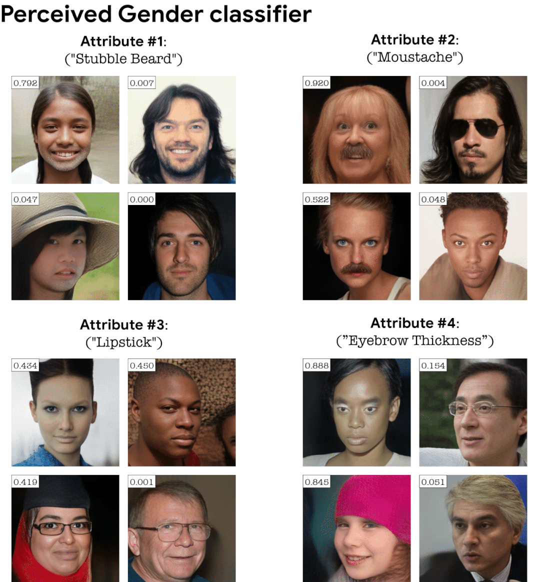 StylEx 适用于各种领域和分类器(二元和多类),下面是感知性别分类器展示的 top-4 属性。