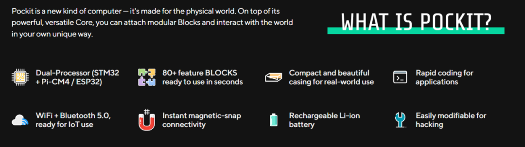 目前项目作者表示,Pockit 的功能组合包括不限于:电脑、游戏机、机器人、LED 灯带、SSD 硬盘阵列、智能家居控制台等等。