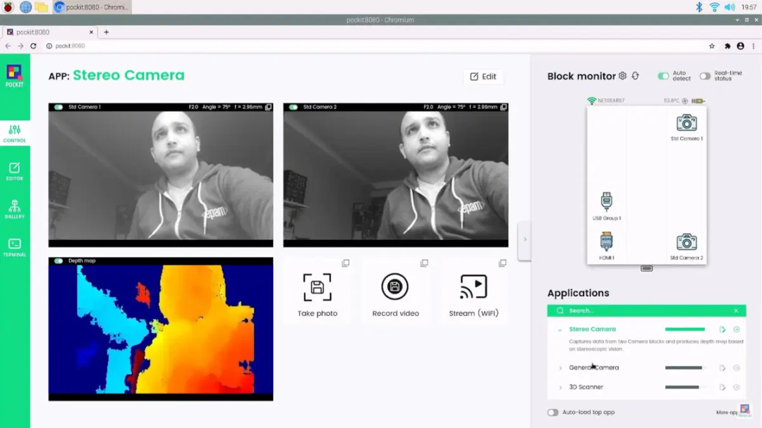 如何让这些组件能够实现自己所需要的功能?作者构建了一套直观的软件系统。接上台式电脑屏幕之后是个 Linux 系统,所有模块都即时显示且可以操作:
