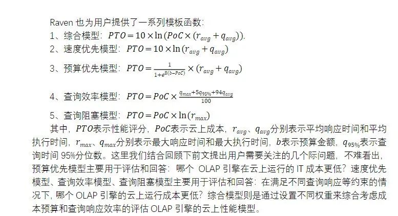 Raven 给出的评分是相对的,只能在相同模型的评分之间进行比较。性能评估得分是云上成本和云上开销的乘积,评分越低,OLAP 引擎的性能越好。云上开销可使用线性模型,对上述参数赋予权重计算;也可使用非线性模型,将上述参数代入到一个函数表达式中。