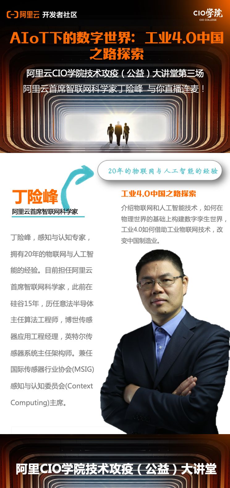2月25日(本周二)晚19:00,锁定阿里云开发者社区直播,对话阿里云首席智联网科学家丁险峰,共同探索AIoT下的数字世界:工业4.0的中国之路。 通过丁险峰的直播,你将了解: