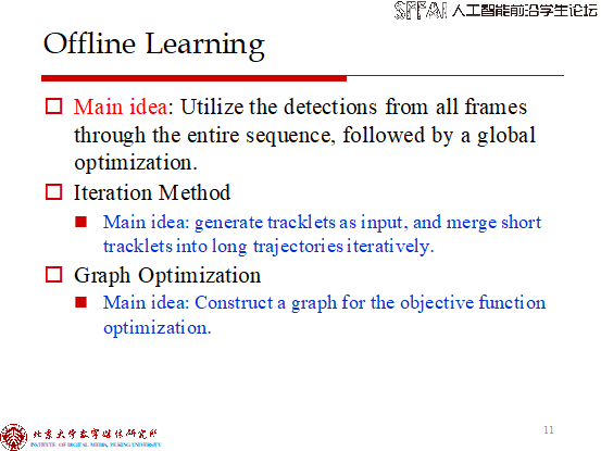 Tracking-by-Detection的方法中多,从跟踪方式上可以分为三大类,包括离线跟踪(Offline MOT)、在线跟踪(Online MOT)以及近似在线跟踪(Near-Online MOT)。其中,离线跟踪的思路是,一次性输入所有的视频帧,将每帧中所有的目标检测出来,然后将问题转化为数据关联(Data Association)的问题。常见的离线跟踪优化方法包括图模型优化【1】以及分层的小轨迹关联方法【2】。