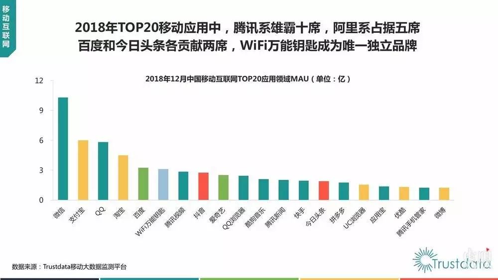 今日,市场研究公司Trustdata发布了《2018年移动互联网行业分析报告》。数据显示,在2018年12月的最新App月活(MAU)排行中,支付宝首次超越QQ,成为国内第二大App。