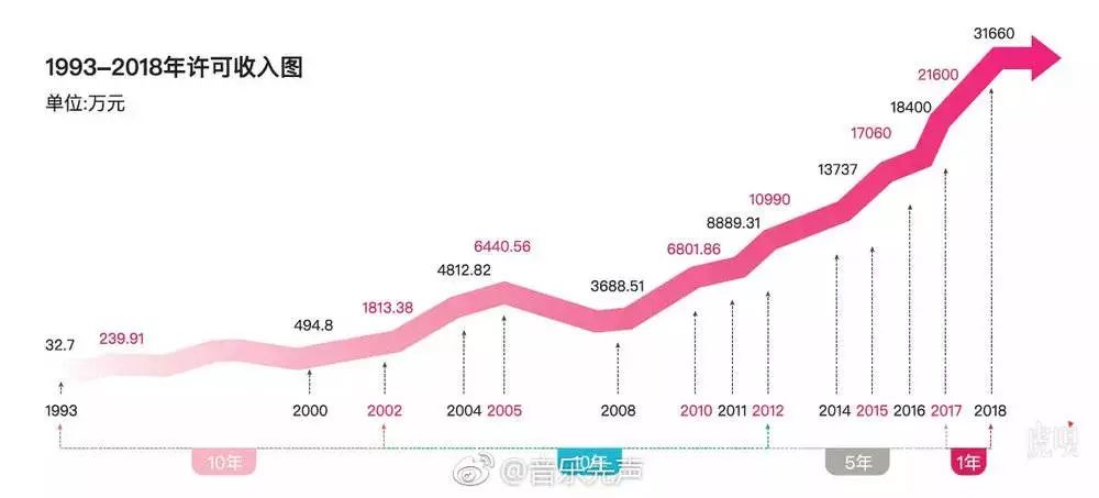 2018年度音著协许可总收入突破3亿,达到人民币3.16亿元,比2017年增长约46.23%,再创历史新高。其中,广播权许可收入约人民币3750万元,表演权许可收入约人民币8982万元,复制权许可收入约人民币1094万元,信息网络传播权许可收入约人民币1.69亿元,海外协会转来许可收入约人民币824万元。