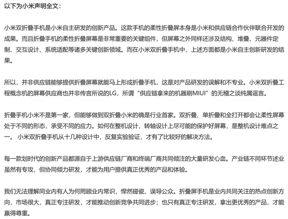 对此,小米官方回应称,折叠手机小米不是第一家,但能够做到双折叠小米的确是行业首家。公司无法理解同业内有人为何罔顾业内常识,悍然碰瓷、误导公众。