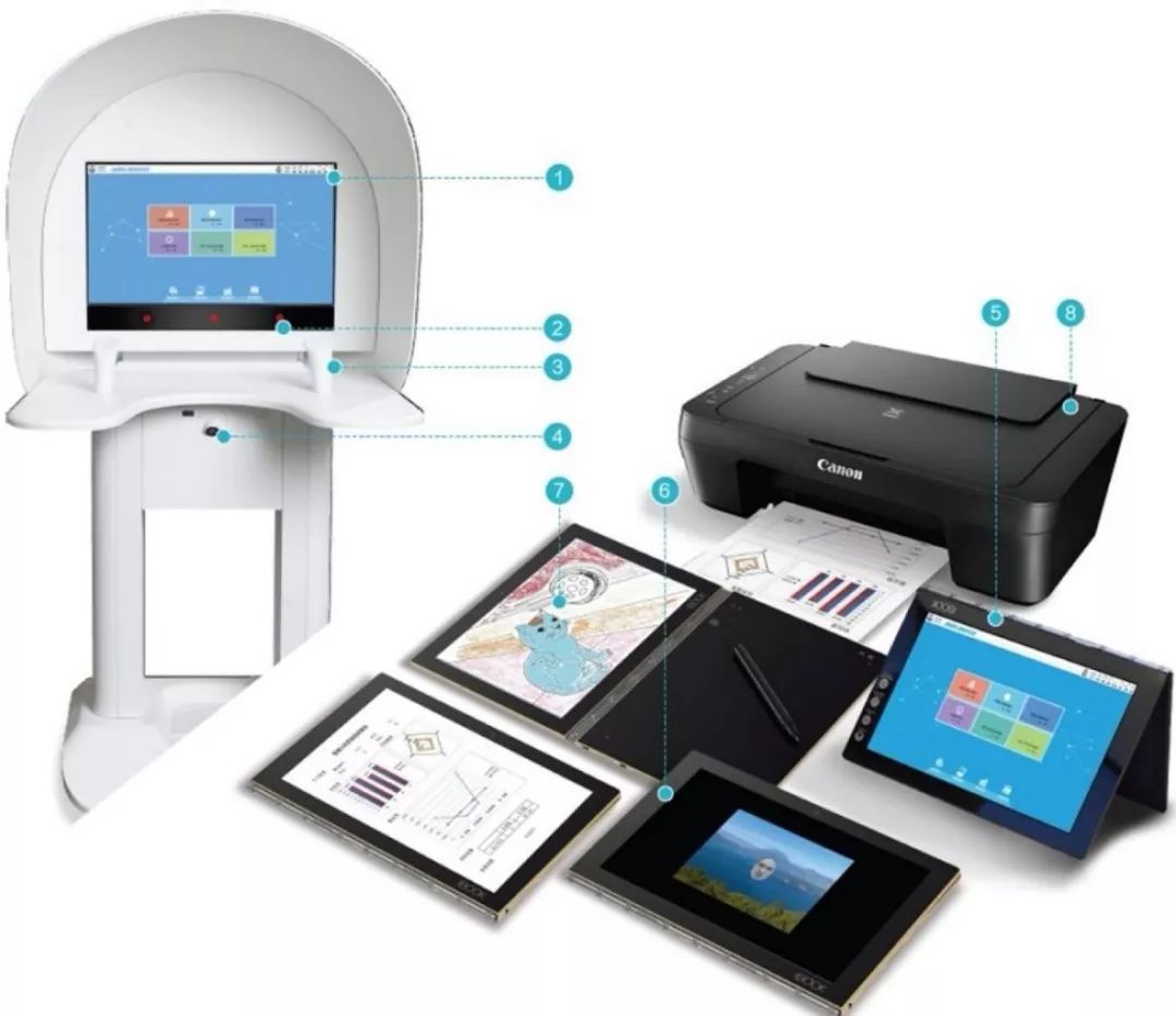 AI心理图仪:①图像认知模块,②眼动追踪模块,③反应时捕捉模块,④定位灯,⑤主控平板,⑥测评平板,⑦干预平板,⑧彩色打印机