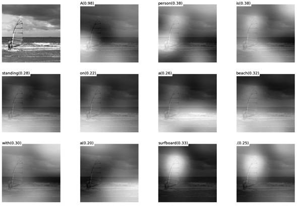 此时如果加入Attention机制能够明显改善系统输出效果,Attention模型在这里起到了类似人类视觉选择性注意的机制,在输出某个实体单词的时候会将注意力焦点聚焦在图片中相应的区域上。图14给出了根据给定图片生成句子“A person is standing on a beach with a surfboard.”过程时每个单词对应图片中的注意力聚焦区域。