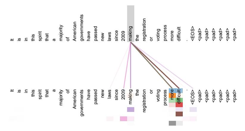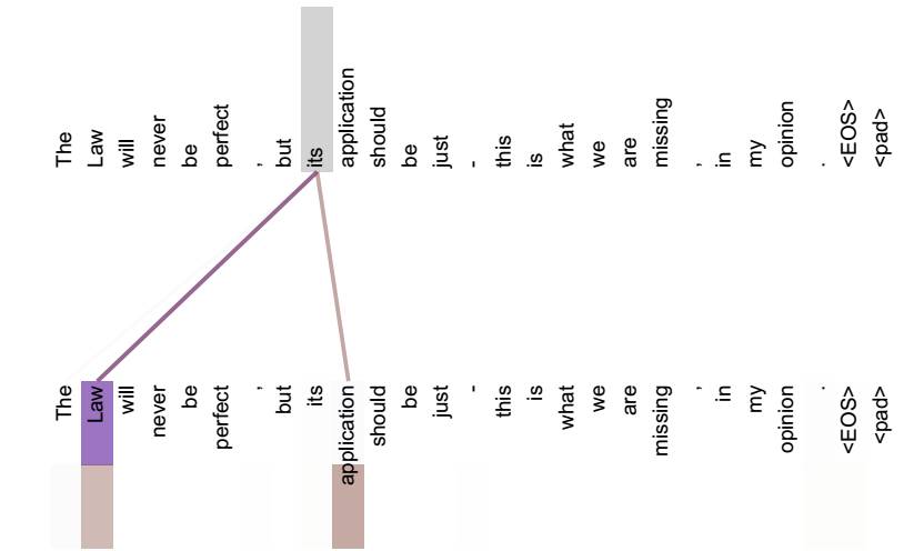 从两张图(图11、图12)可以看出,Self Attention可以捕获同一个句子中单词之间的一些句法特征(比如图11展示的有一定距离的短语结构)或者语义特征(比如图12展示的its的指代对象Law)。