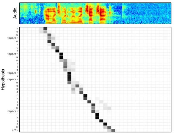 图16可视化地展示了在Encoder-Decoder框架中加入Attention机制后,当用户用语音说句子 how much would a woodchuck chuck 时,输入部分的声音特征信号和输出字符之间的注意力分配概率分布情况,颜色越深代表分配到的注意力概率越高。从图中可以看出,在这个场景下,Attention机制起到了将输出字符和输入语音信号进行对齐的功能。