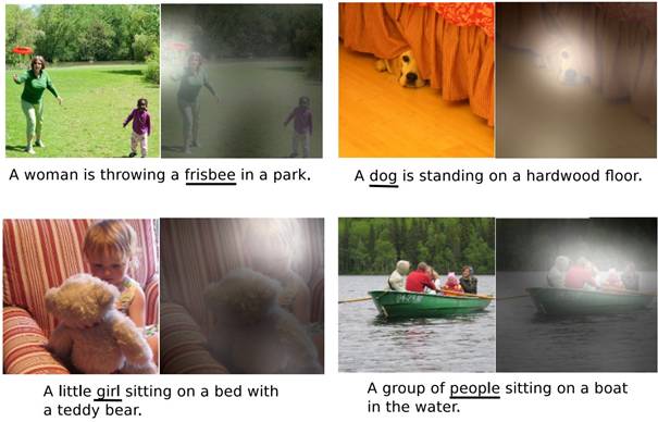 图15给出了另外四个例子形象地展示了这种过程,每个例子上方左侧是输入的原图,下方句子是人工智能系统自动产生的描述语句,上方右侧图展示了当AI系统产生语句中划横线单词的时候,对应图片中聚焦的位置区域。比如当输出单词dog的时候,AI系统会将注意力更多地分配给图片中小狗对应的位置。