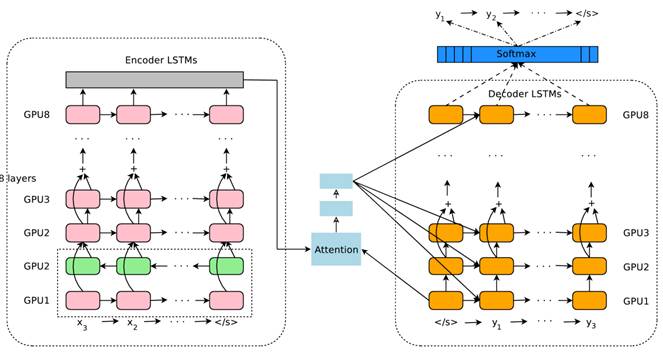 图8所示即为Google于2016年部署到线上的基于神经网络的机器翻译系统,相对传统模型翻译效果有大幅提升,翻译错误率降低了60%,其架构就是上文所述的加上Attention机制的Encoder-Decoder框架,主要区别无非是其Encoder和Decoder使用了8层叠加的LSTM模型。