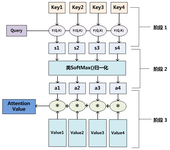 通过如上三个阶段的计算,即可求出针对Query的Attention数值,目前绝大多数具体的注意力机制计算方法都符合上述的三阶段抽象计算过程。